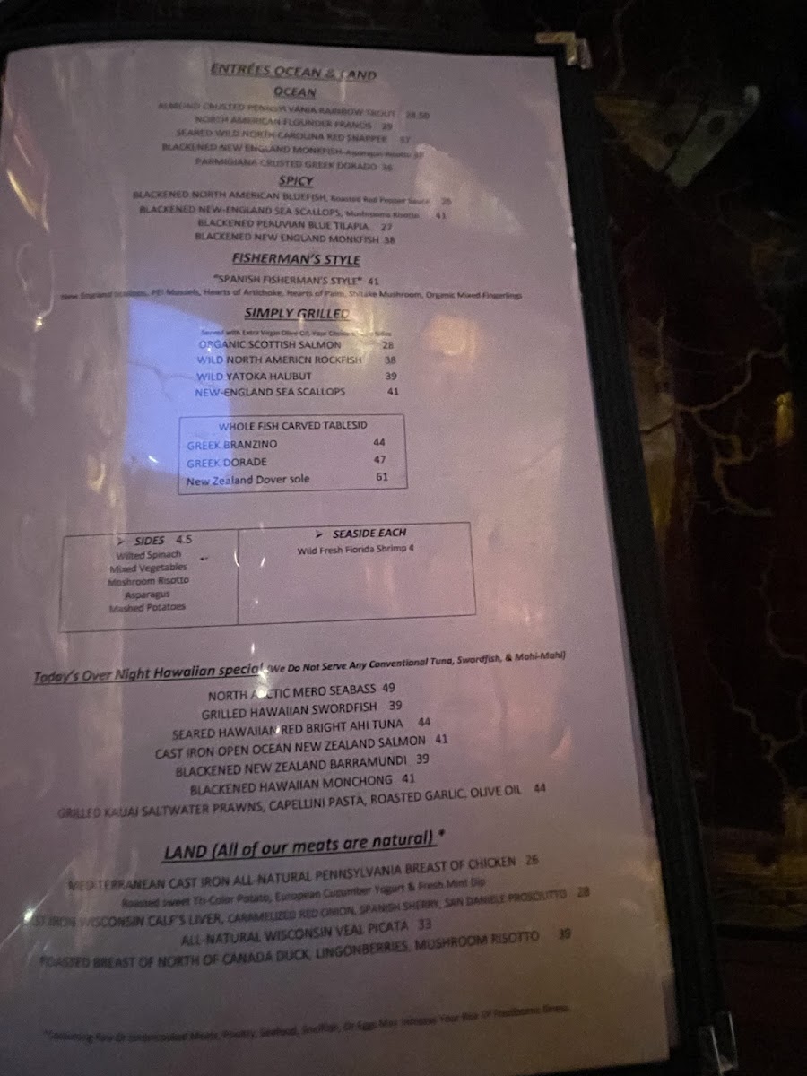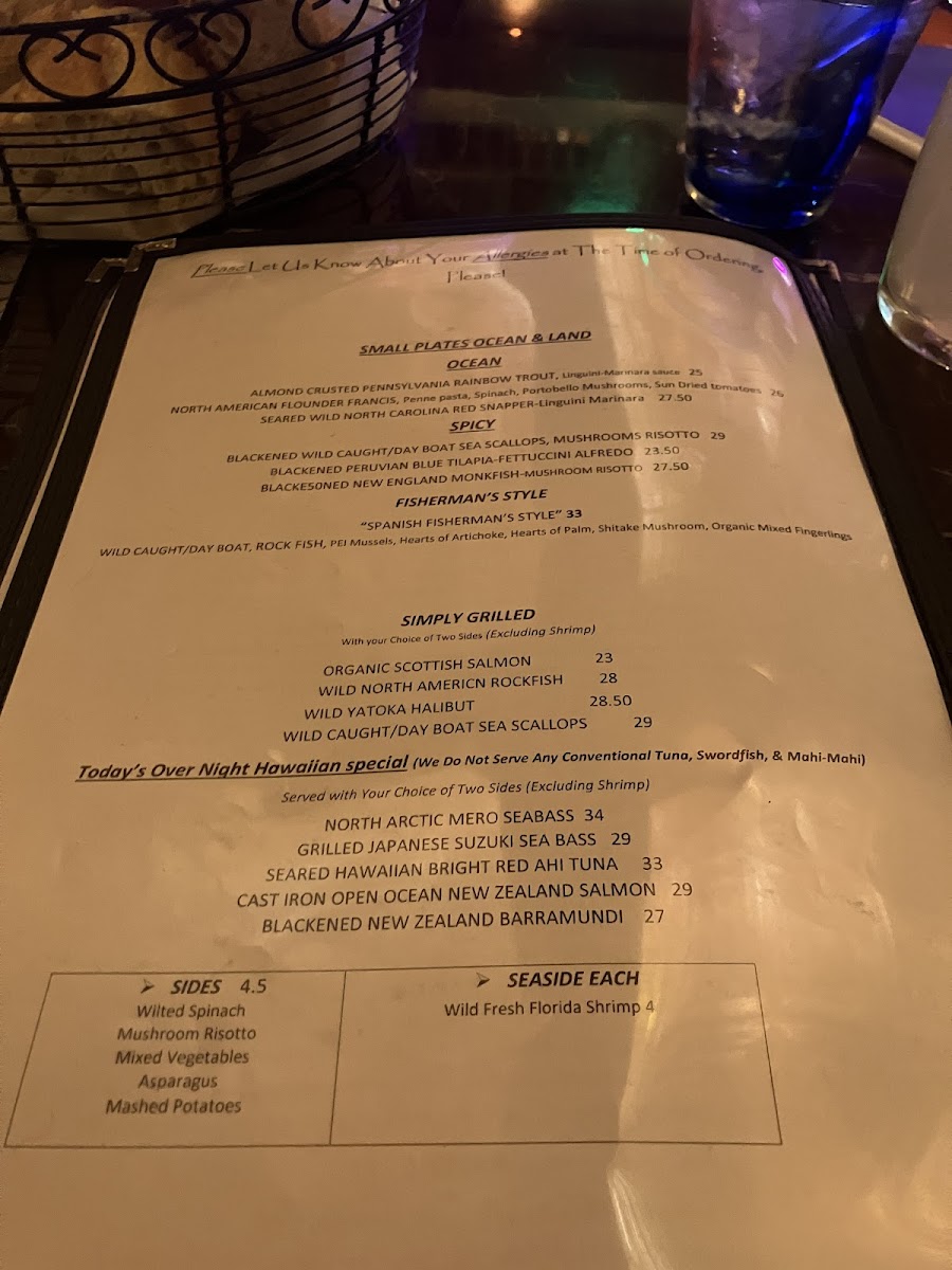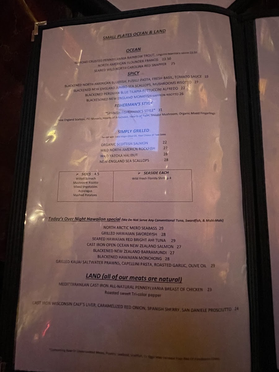 Wild Rock fish, New England Scallops, PEI Mussels, Hearts of Artichoke, Hearts of Palm, Portobello Mushroom, Red Potato